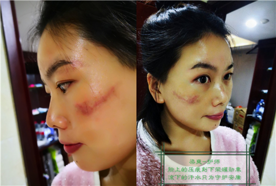 从隔离病房出来,脱下防护装备后,面颊被口罩勒出深深的伤痕,抹点药膏,第二天继续投入战斗。