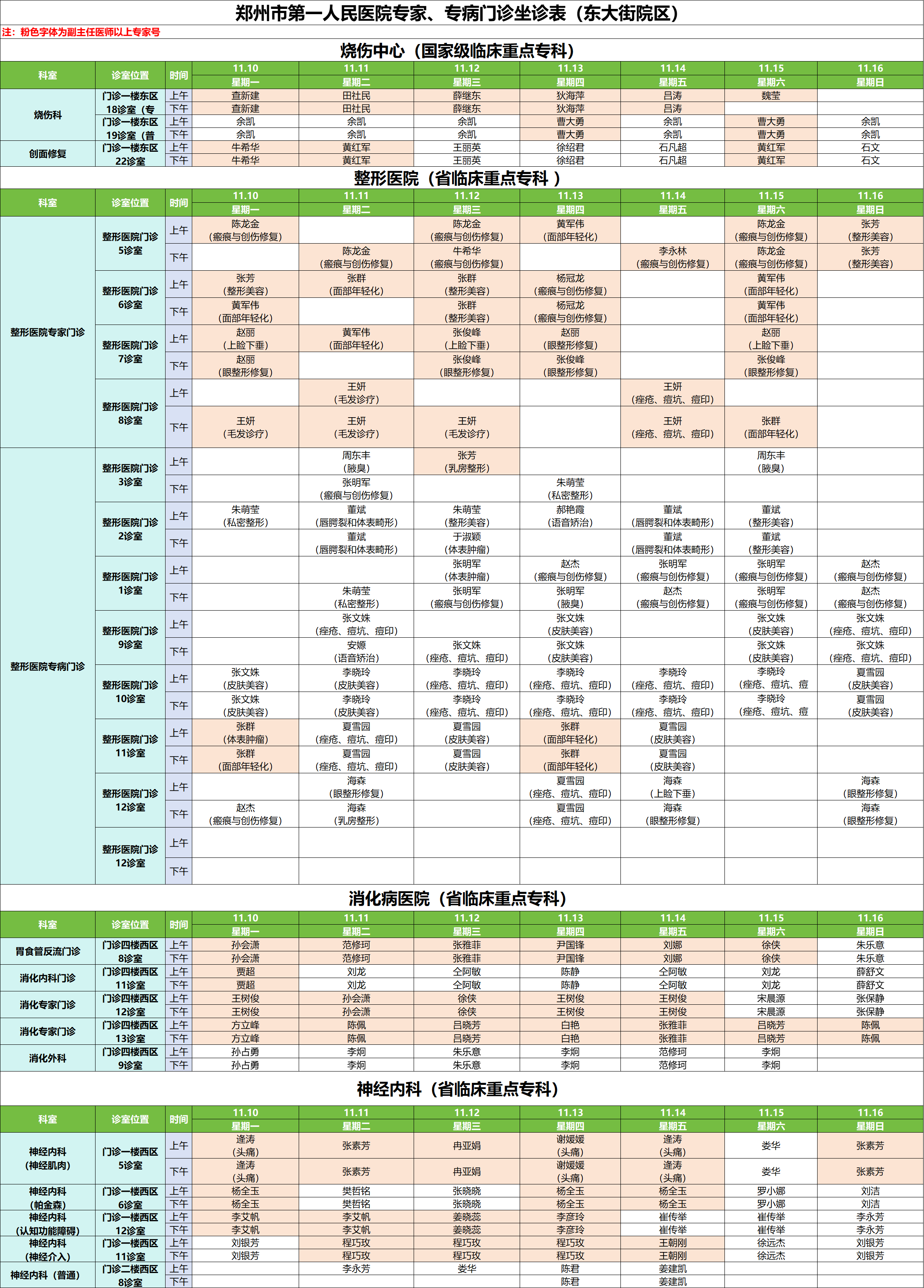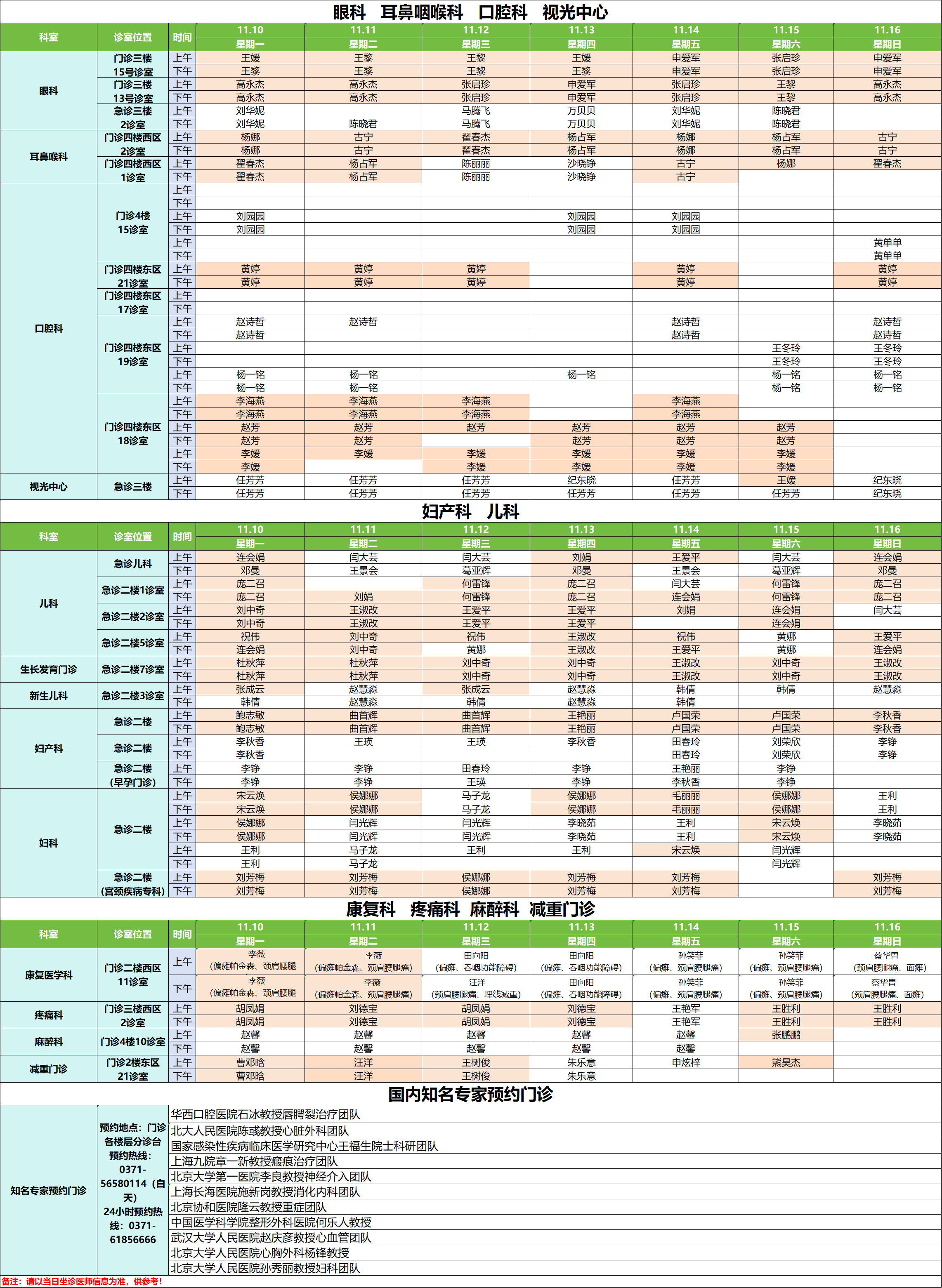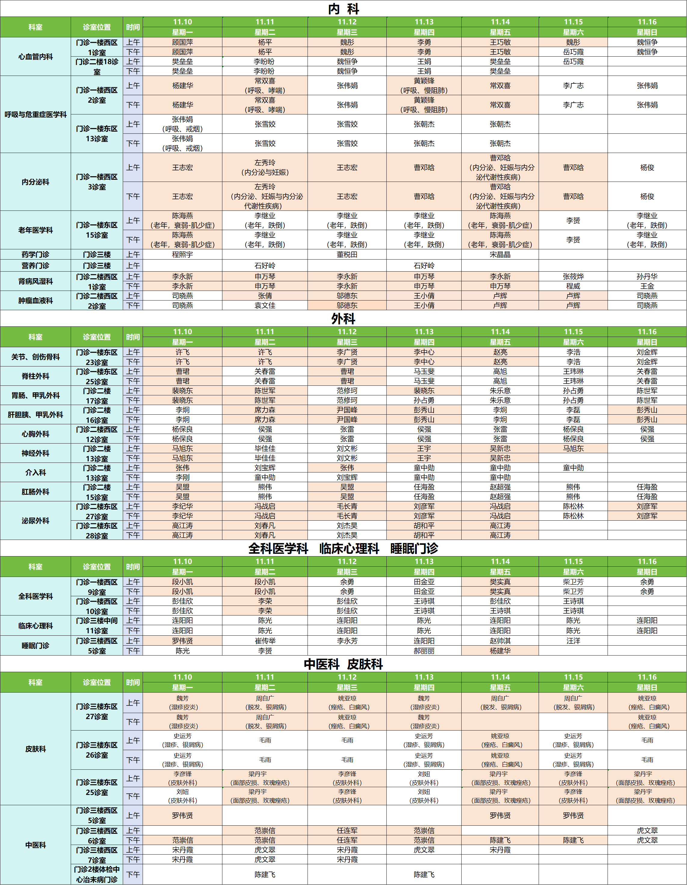 11月10日——11月16日门诊排班表